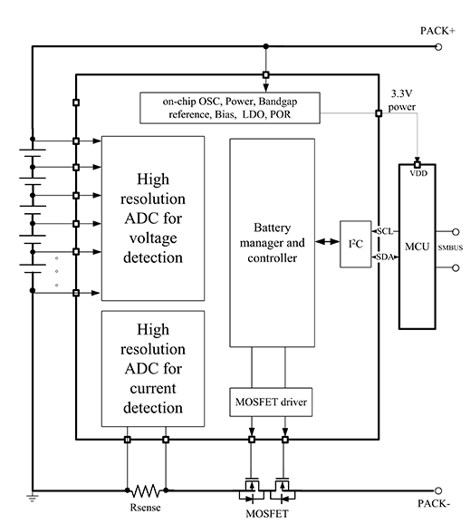 HSM12X0 系列芯片可作為3-15 節(jié)串聯(lián)電池組監(jiān)控和保護(hù)解決方案的一部分。通過I2C 通信,MCU 可以使用HSM12X0 來執(zhí)行電池管理功能,例如監(jiān)測(cè)(電池電壓、電池組電流、電池組溫度)、保護(hù)(控制充電/放電FET)以及電池組均衡功能等。集成的模數(shù)轉(zhuǎn)換器可實(shí)現(xiàn)MCU 對(duì)電池組關(guān)鍵參數(shù)(電壓、電流以及溫度)的純數(shù)字讀取,這些參數(shù)的校準(zhǔn)在制造過程中處理。HSM12X0 在設(shè)計(jì)時(shí)充分考慮了低功耗要求,既可通過使能/禁用集成電路IC 中的子模塊來控制整個(gè)芯片的功耗,又可以利用SHIP 模式將電池組切換至超低功耗狀態(tài)。