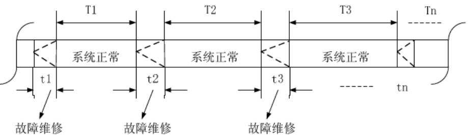 (1)可靠性,指某一時間段內(nèi)設(shè)備或系統(tǒng)連續(xù)運(yùn)行而無故障發(fā)生的概率。重要表征參數(shù)是平均無故障時間(Mean Time Between Failure,簡稱MTBF)是指相鄰兩次故障之間的平均工作時間,也稱平均故障間隔時間。如圖1所示MTBF= ,系統(tǒng)故障率λ= 1/MTBF。