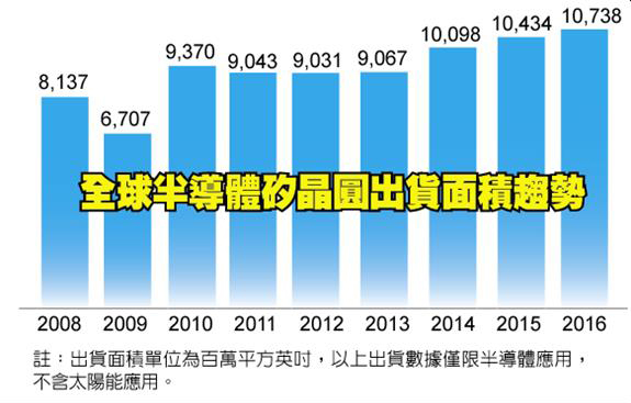 依據(jù)國際半導(dǎo)體產(chǎn)業(yè)協(xié)會(SEMI)旗下硅晶圓制造者部門SMG(Silicon Manufacturers Group)公布的年終硅晶圓產(chǎn)業(yè)分析報告顯示,2016年全球半導(dǎo)體硅晶圓出貨總面積達(dá)10,738百萬平方英吋,年成長率達(dá)3%,連續(xù)3年創(chuàng)下出貨量歷史記錄新高。
