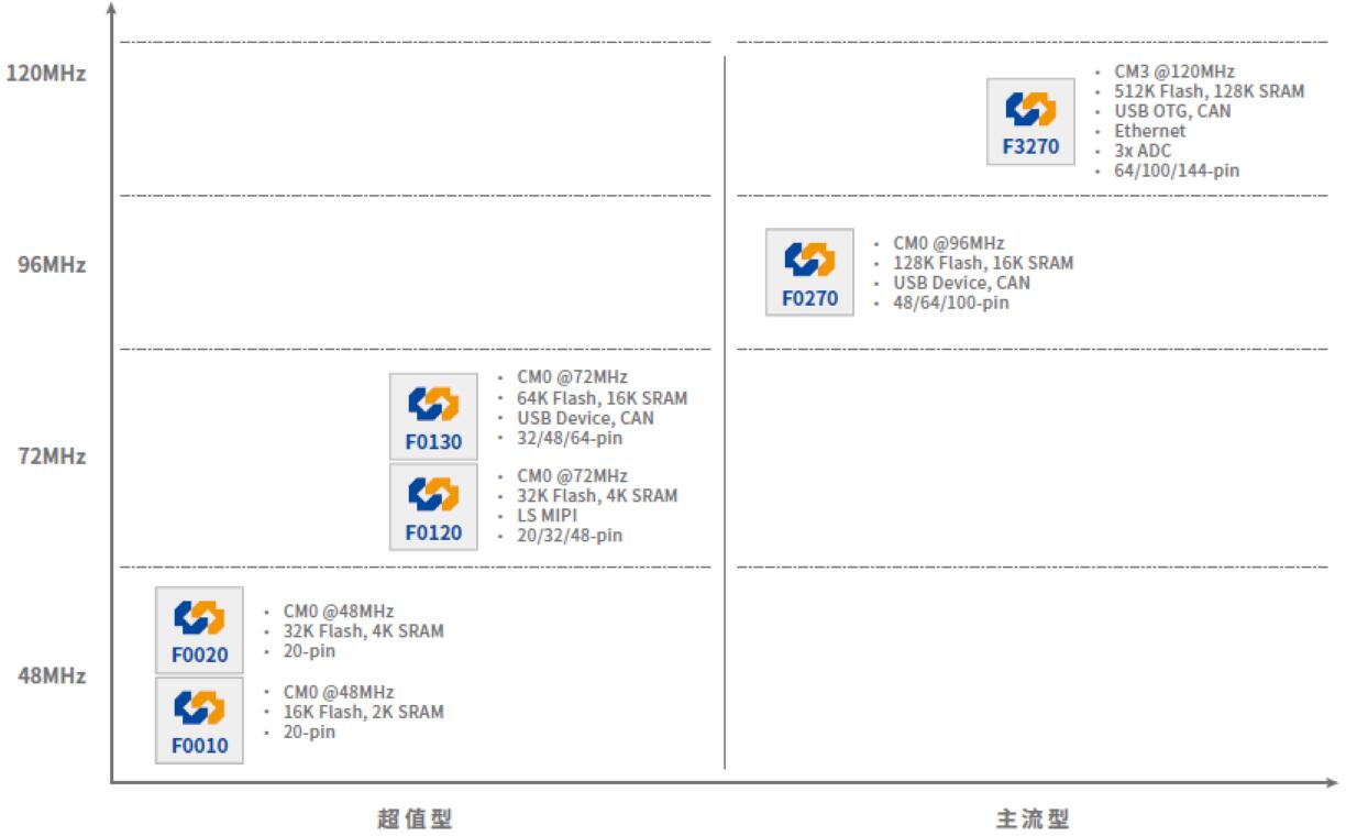 在超值型產(chǎn)品中,增加了可用的GPIO數(shù)量,并提高了72MHz M0產(chǎn)品的存儲容量比,以便支持更強(qiáng)的計算處理能力。