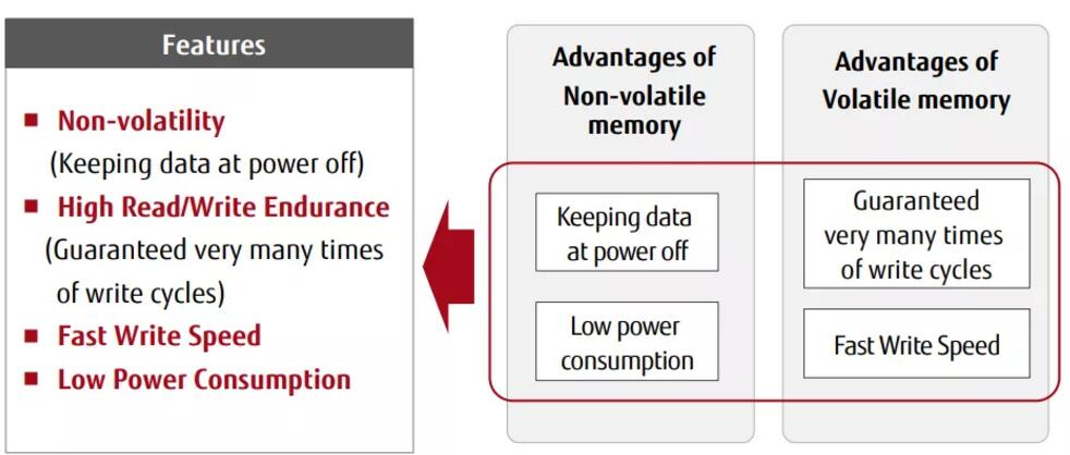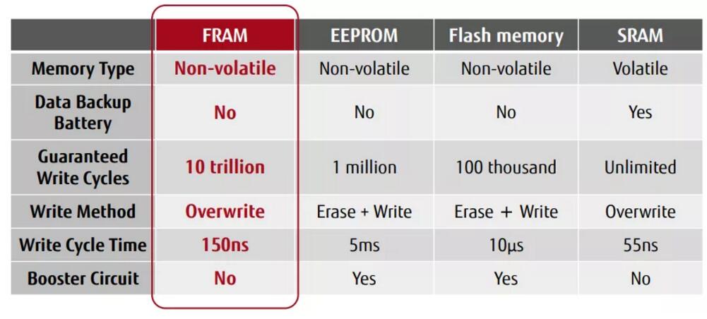 獨(dú)特性能成就技術(shù)“硬核”,F(xiàn)RAM是存儲(chǔ)界的實(shí)力派。除非易失性以外,F(xiàn)RAM還具備三大主要優(yōu)勢(shì):高讀寫入耐久性、高速寫入以及低功耗,這是絕大多數(shù)同類型存儲(chǔ)器無法比擬的。