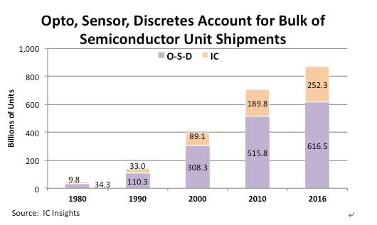 雖然集成電路技術(shù)不斷發(fā)展,越來越多的功能被集成到一顆存儲(chǔ)芯片中,從而以系統(tǒng)的角度來看用到的芯片數(shù)量越來越少,但I(xiàn)C Insights的統(tǒng)計(jì)結(jié)果顯示,全球半導(dǎo)體出貨量中,集成電路占比依然很低,而光電器件、傳感器與分立器件(Opto-Sensor-Discrete,簡(jiǎn)稱O-S-D)的比重仍然超過七成。