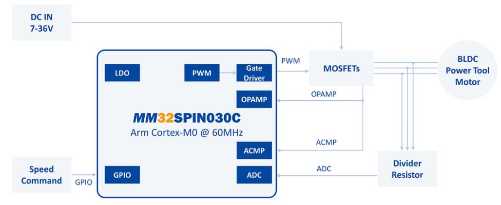 MM32SPIN030C,Arm® Cortex-M0內(nèi)核,最高工作頻率可達(dá)60MHz,內(nèi)置存儲(chǔ)器32KB Flash和4KB SRAM,具有1 路 12 位模數(shù)轉(zhuǎn)換器 ADC,支持 11 通道,采樣速率 1Msps,4 個(gè)通用定時(shí)器,1 個(gè)針對(duì)電機(jī)控制的 PWM 高級(jí)定時(shí)器,支持 UART/SPI 通信,針對(duì)電機(jī)應(yīng)用內(nèi)置 2 個(gè)運(yùn)放、2 個(gè)比較器,內(nèi)置三相 P/N 柵極驅(qū)動(dòng)器。