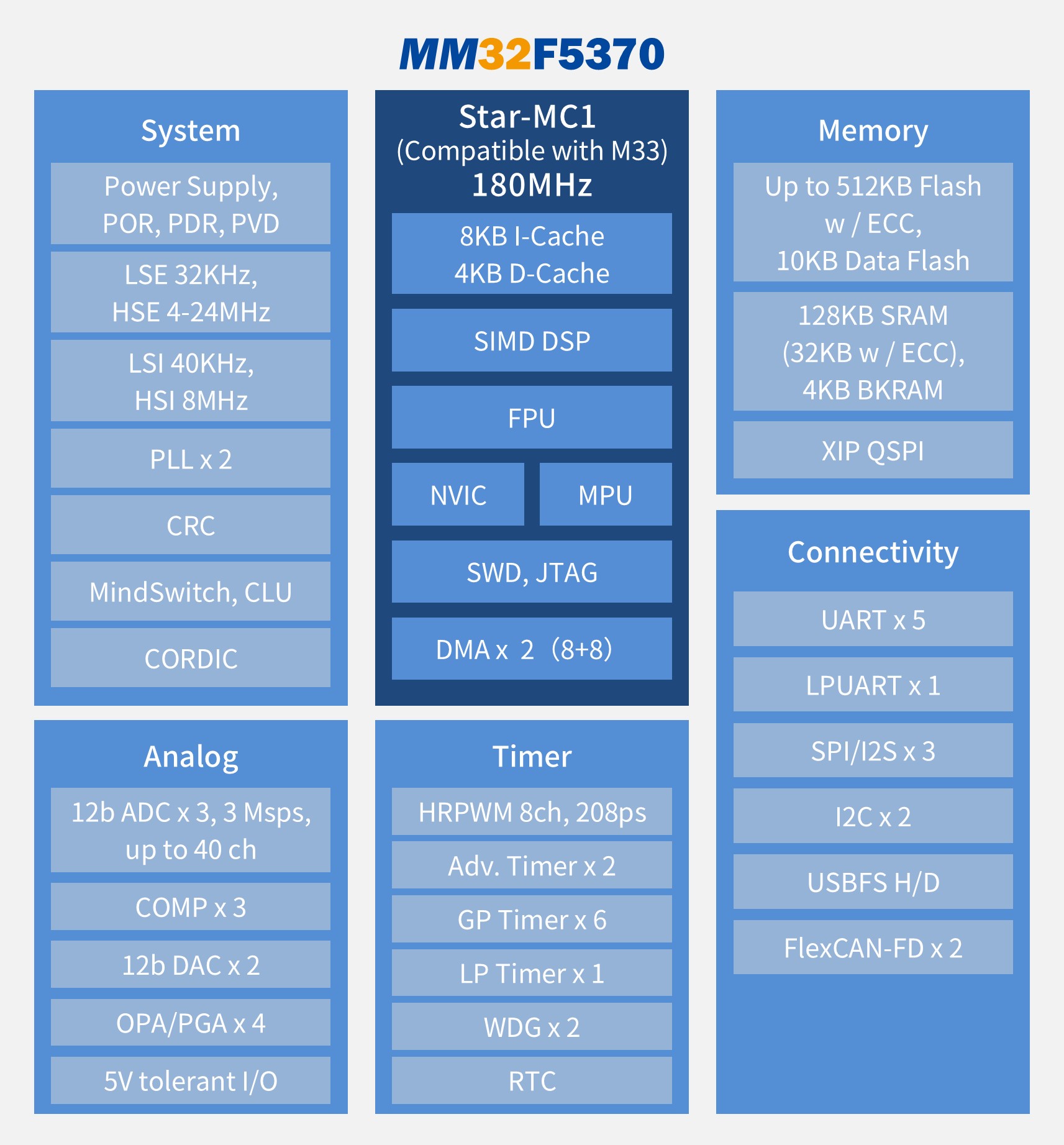 MM32F5370搭載國產(chǎn)Star-MC1內(nèi)核,基于Armv8-M架構(gòu),指令集兼容Cortex-M33,提供高達(dá)512KB flash,支持ECC,并提供分區(qū)讀保護(hù),支持代碼二次開發(fā),保護(hù)方案商利益;另有10KB Data Flash,獨(dú)立分區(qū)。提供高達(dá)128KB SRAM,其中32KB支持ECC;另有4KB retentionRAM,可在Standby模式下對數(shù)據(jù)進(jìn)行保持。提供QSPI外部存儲(chǔ)擴(kuò)展接口,并支持XIP。該型號滿足三電機(jī)應(yīng)用的實(shí)時(shí)控制需求。