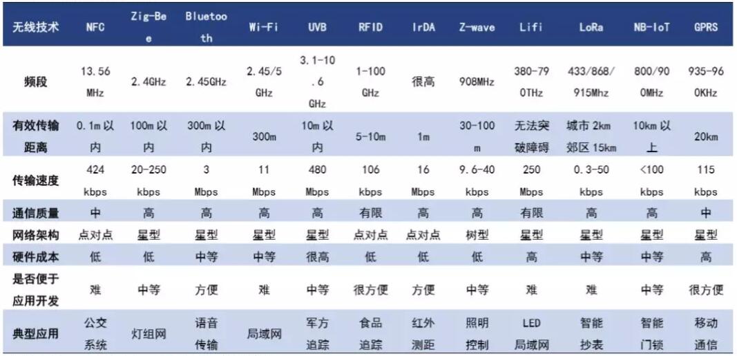 無線通信技術(shù)主要分廣域網(wǎng)和局域網(wǎng)兩種,具體差別在傳輸距離和通信協(xié)議方面。局域網(wǎng)無線通信技術(shù)包括、WIFI、藍牙、ZigBee、UWB、RFID、LiFi等,傳輸一般在0-300米;廣域網(wǎng)無線通信技術(shù)包括GPRS、LoRa、NB-IoT等,有效傳輸距離在公里級。藍牙是最主要的局域網(wǎng)(短距離)無線通信方式之一,適合覆蓋距離在百米以內(nèi)、數(shù)據(jù)傳輸量較小的通信。