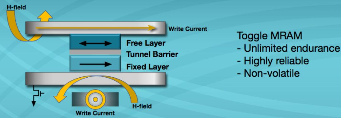 切換MRAM使用1個晶體管,1個MTJ單元來提供簡單的高密度存儲器。Everspin使用獲得專利的Toggle電池設(shè)計(jì),可提供高可靠性。數(shù)據(jù)在溫度下20年始終是非易失性的。