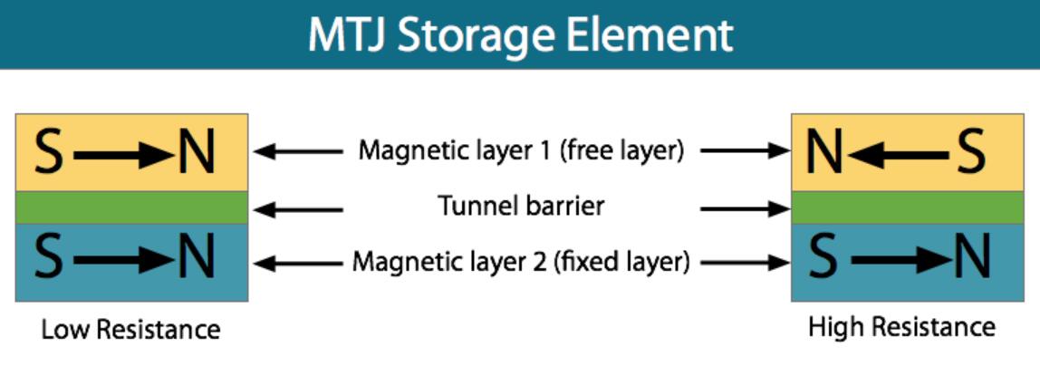 當(dāng)自由層的磁矩平行于固定層時(shí),MTJ器件具有低電阻,而當(dāng)自由層磁矩與固定層矩反平行時(shí),MTJ器件具有高電阻。