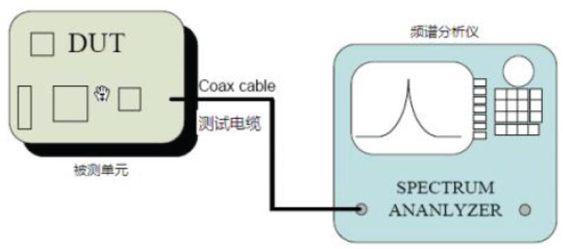 射頻發(fā)射信號通過產品的天線耦合到頻譜分析儀。測試裝置連接如下:
