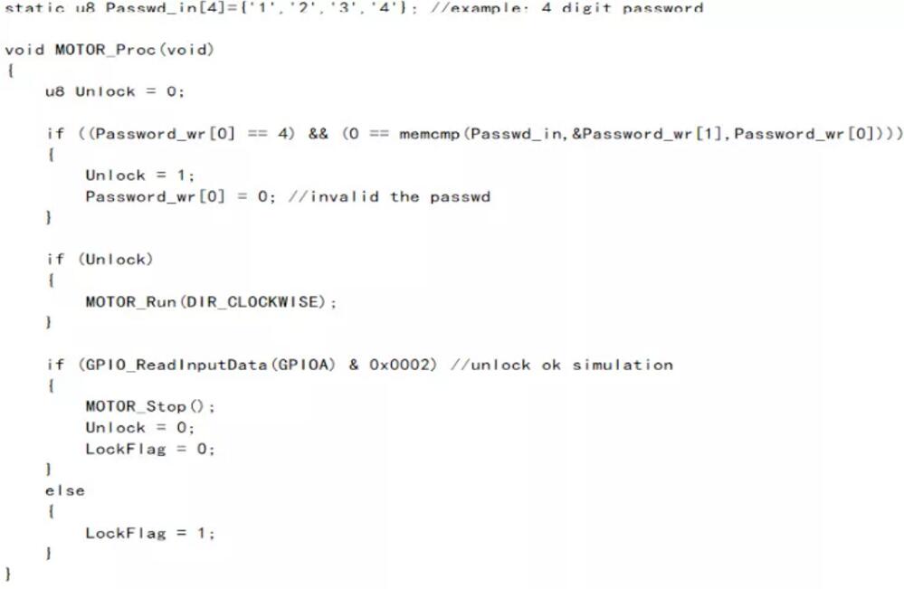 在MOTOR_Proc()處理函數(shù)中針對(duì)藍(lán)牙接收到的密碼數(shù)據(jù)進(jìn)行解析,如果與默認(rèn)設(shè)置的4位0-9數(shù)字密碼完全匹配上則操作解鎖,將DC馬達(dá)按照設(shè)定方向控制運(yùn)轉(zhuǎn),為了簡(jiǎn)易驗(yàn)證,模擬一個(gè)信號(hào)表示解鎖成功,這里是通過(guò)采集指定IO引腳PA1的輸入來(lái)實(shí)現(xiàn),采集到輸入為高電平那么停止DC馬達(dá)轉(zhuǎn)動(dòng),且清零鎖定標(biāo)志位。以下為代碼實(shí)現(xiàn)內(nèi)容: