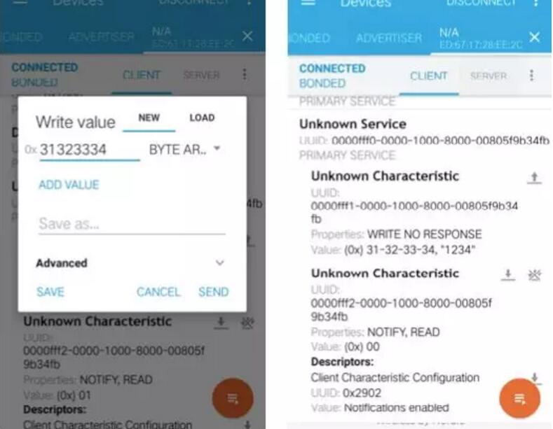 連接成功后,對(duì)UUID為fff1的特征值寫(xiě)0x31323334(模擬用戶輸入密碼”1234”),測(cè)試板上連接的馬達(dá)開(kāi)始轉(zhuǎn)動(dòng),執(zhí)行開(kāi)鎖動(dòng)作;