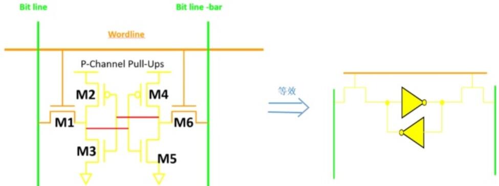 一個6T sram cell的經(jīng)典結(jié)構(gòu)如圖所示: