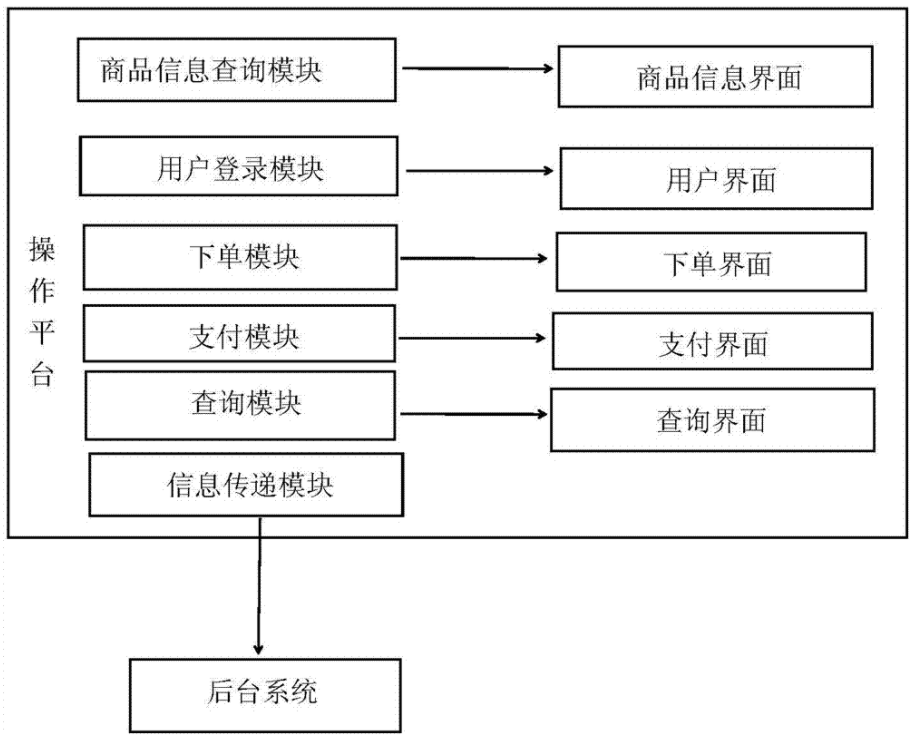 基于實物展示的共享網(wǎng)絡(luò)銷售柜,該銷售柜柜設(shè)有多個展示臺和操作電腦;展示臺用以擺放展示商品,展示柜分為多層多格,用以存放不同的物品;操作電腦連通公共網(wǎng)絡(luò),具有主機和操作平臺;操作平臺上設(shè)有商品信息查詢模塊,用戶登錄模塊,下單模塊,支付模塊,查詢模塊和信息傳遞模塊;買家通過展示臺選中商品后,在操作平臺上登錄商品信息查詢模塊,通過該商品信息查詢模塊的商品信息界面了解商品信息,通過用戶登錄模塊的用戶界面登錄,通過下單模塊的下單界面購買商品,通過支付模塊的支付界面完成付款和打印發(fā)票,通過查詢模塊的查詢界面查詢購買信息;信息傳遞模塊將用戶購買信息通過網(wǎng)絡(luò)發(fā)送給商家;商家接收到購買信息后,通過物流將產(chǎn)品發(fā)送給買家。
