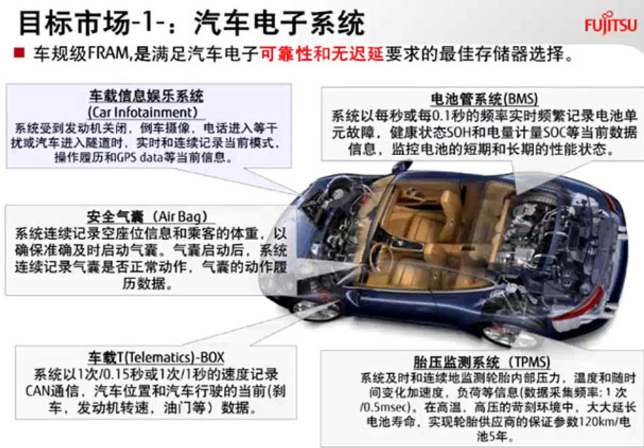 富士通FRAM早已能適用如汽車安全氣囊數(shù)據(jù)信息存儲(chǔ)(Airbag)、安全事故數(shù)據(jù)信息記錄軟件(EDR)、充電電池智能管理系統(tǒng)(BMS)、新能源汽車全車自動(dòng)控制系統(tǒng)(VCU),新能源汽車CAN小盒子(CAN-BOX)、新能源汽車載終端設(shè)備(T-BOX)、胎壓監(jiān)測裝置(TPMS)、車輛駕駛輔助系統(tǒng)軟件(ADAS)及導(dǎo)航欄與信息內(nèi)容車載多媒體(infotainment)等運(yùn)用中的即時(shí)且不斷的數(shù)據(jù)信息存儲(chǔ),所以能減少系統(tǒng)軟件復(fù)雜性并提升數(shù)據(jù)庫安全,。