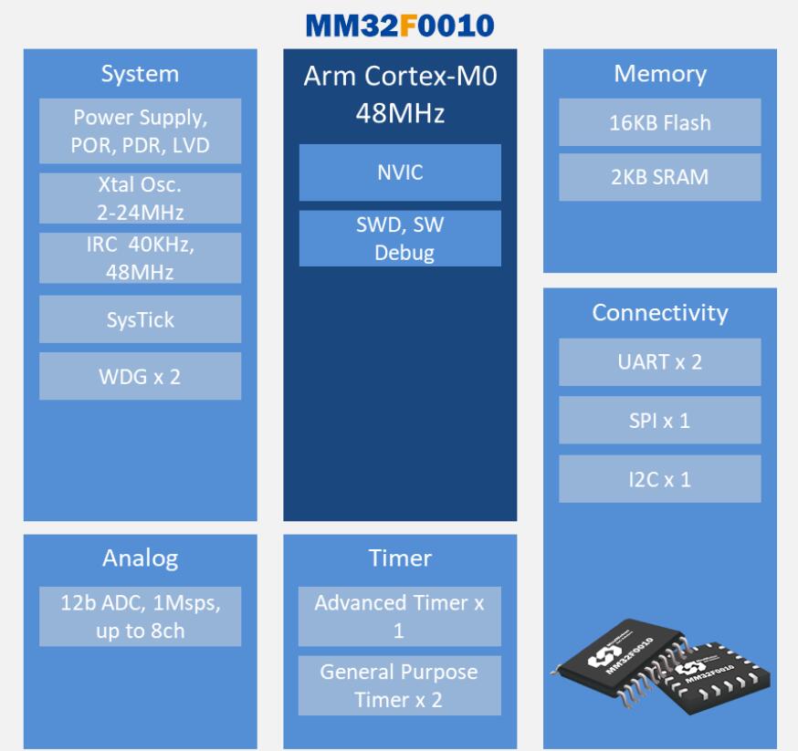 MM32F0010在性能、功耗和外設(shè)配置方面具有顯著的特點(diǎn),其中包括: