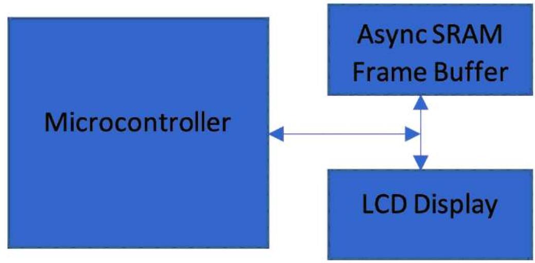 SRAM將無(wú)法提供足夠的容量或性能。為了避免畫(huà)面撕裂,也有必要采用雙緩存。在這些系統(tǒng)中通常在外部存儲(chǔ)器中實(shí)現(xiàn)幀緩存。在刷新周期中,從外部幀緩存讀取數(shù)據(jù),并連同控制信號(hào)輸出給顯示控制器數(shù)據(jù)總線。圖1所示的是采用外部幀緩存的典型顯示框圖。