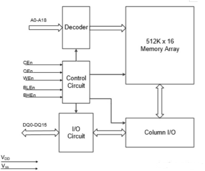 圖中A0~18為地址線,總共19根地址線(即2^19=512K,1K=1024);DQ0~15為數(shù)據(jù)線,總共16根數(shù)據(jù)線。CEn是芯片使能信號,低電平有效;OEn是輸出使能信號,低電平有效;WEn是寫使能信號,低電平有效;BLEn和BHEn分別是高字節(jié)控制和低字節(jié)控制信號;