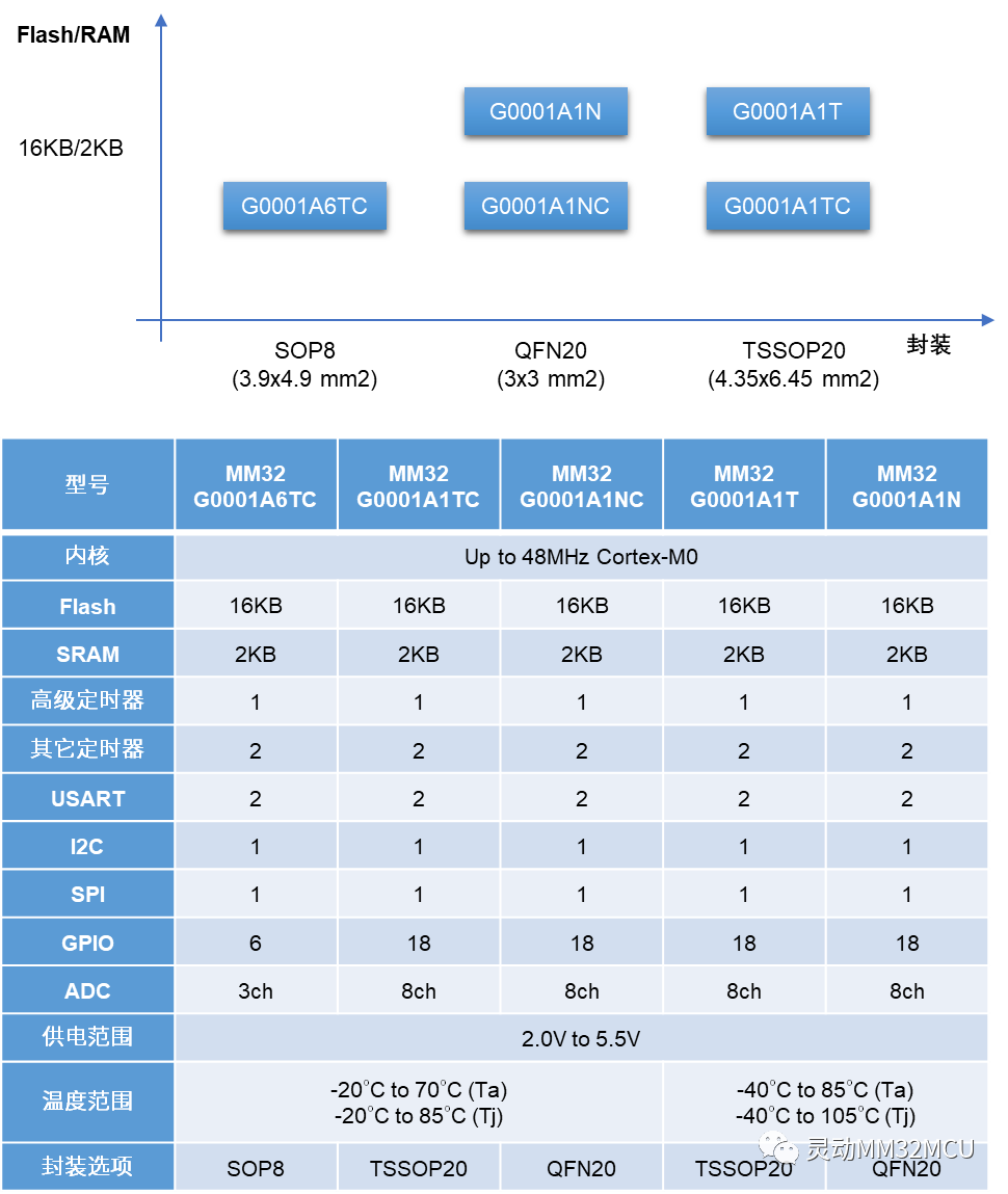 MM32G0001提供TSSOP20,QFN20和SOP8三種封裝,提供-40~85℃工業(yè)級(jí)和-20~70℃消費(fèi)級(jí)環(huán)境溫度選項(xiàng),共推出5款型號(hào)可供選擇。支持為特定客戶(hù)和應(yīng)用定制DFN、DIP和SOP等常見(jiàn)的小引腳封裝。