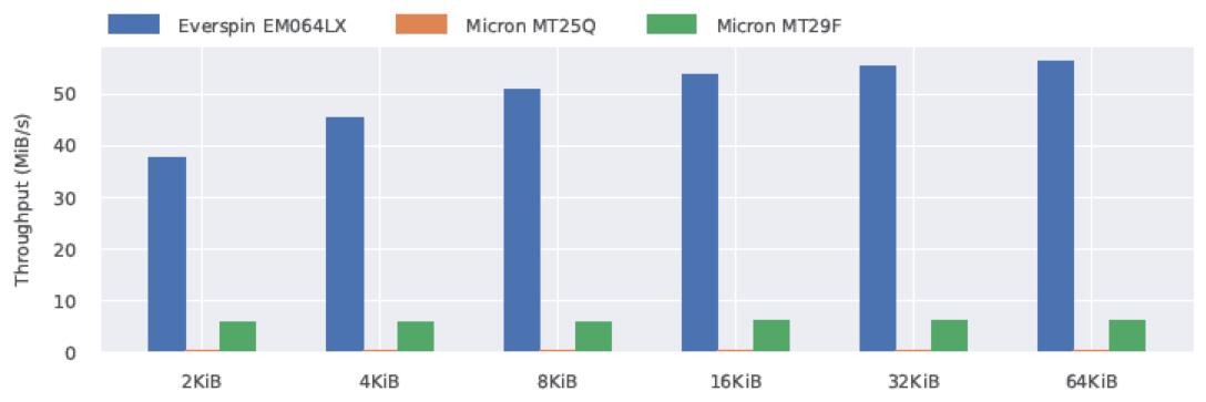 對于每個(gè)芯片,讀取/寫入64MiB的數(shù)據(jù),從地址0開始,到地址8388608(8MiB)結(jié)束。我們對各種訪問大小重復(fù)該過程:2KiB、4KiB、8KiB、16KiB、32KiB和64KiB。在閃存中,每個(gè)塊在寫入第一頁之前都會(huì)被擦除。擦除時(shí)間包括在寫入吞吐量測量中。