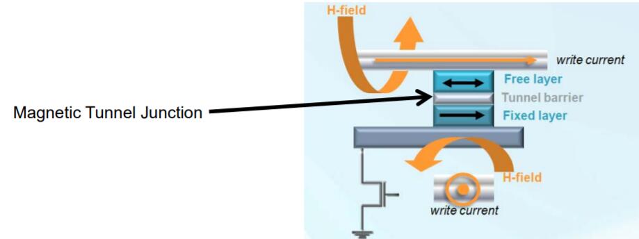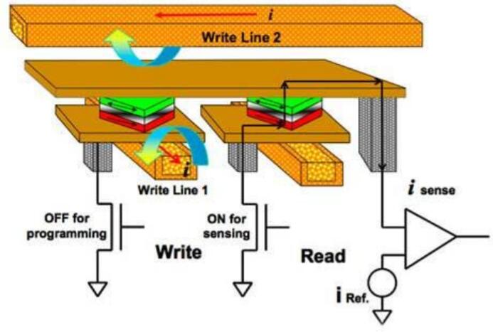 MRAM或磁性隨機(jī)存取存儲器使用1晶體管–1磁性隧道結(jié)(1T-1MTJ)架構(gòu),其中鐵磁材料的磁性“狀態(tài)”作為數(shù)據(jù)存儲元素。由于MRAM使用磁性狀態(tài)進(jìn)行存儲(而不是隨時(shí)間推移而“泄漏”的電荷),因此
