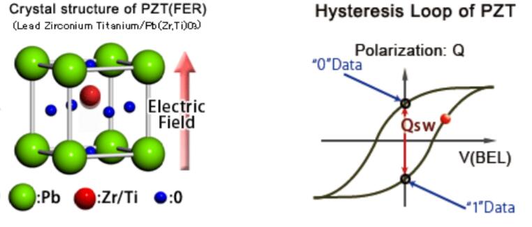 FRAM或鐵電隨機(jī)存取存儲器使用1個(gè)晶體管–1個(gè)鐵電電容器(1T-1FC)架構(gòu),該架構(gòu)采用鐵電材料作為存儲設(shè)備。這些材料的固有電偶極子在外部電場的作用下轉(zhuǎn)換為相反極性。改變鐵電極化態(tài)需要偶極子(位于氧八面體中的Ti4+離子)移動(在Pb(Zr,Ti)O3的情況下)對電場的響應(yīng)(圖4)。自由電荷或其他隨時(shí)間和溫度累積的離子缺陷會阻止這種運(yùn)動,這些缺陷會導(dǎo)致偶極子隨時(shí)間松弛,從而導(dǎo)致疲勞。