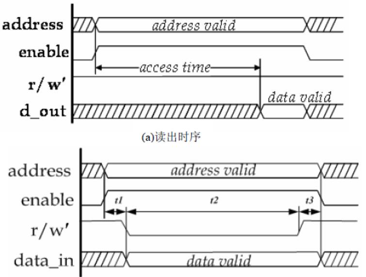 SRAM存儲器的讀寫時序。在讀出操作中,訪問時間(access time)就是指從地址有效算起,到有效數據輸出的時間;圖1.4 (b)中t1 是從地址和使能信號穩(wěn)定到寫信號有效所需的最小時間,t2 是寫信號無效之前必須保持的最小時間,t3是寫信號無效之后地址信號仍需保持的最小時間。t1、t2、t3 相加就是一個寫周期時間。