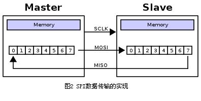 這是通過移位寄存器來實(shí)現(xiàn)的。如圖2所示,主機(jī)和從機(jī)各有一個(gè)移位寄存器,且二者連接成環(huán)。隨著時(shí)鐘脈沖,數(shù)據(jù)按照從高位到低位的方式依次移出主機(jī)寄存器和從機(jī)寄存器,并且依次移入從機(jī)寄存器和主機(jī)寄存器。當(dāng)寄存器中的內(nèi)容全部移出時(shí),相當(dāng)于完成了兩個(gè)寄存器內(nèi)容的交換。