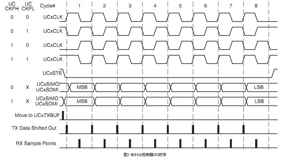 舉例來說,分別選取MSP430控制器和OLED驅(qū)動(dòng)SH1101A為主從機(jī),圖3和圖4為它們的SPI時(shí)序。由圖4可知,SH1101A的SPI時(shí)鐘空閑時(shí)為高電平,并且在后時(shí)鐘沿接收數(shù)據(jù),則MSP430控制器SPI的設(shè)置應(yīng)與此保持一致。從圖3中可以看出,要使得時(shí)鐘在空閑時(shí)為高電平,應(yīng)將UCCKPL置1;要使得在后時(shí)鐘沿接收數(shù)據(jù),應(yīng)將UCCKPH清零。