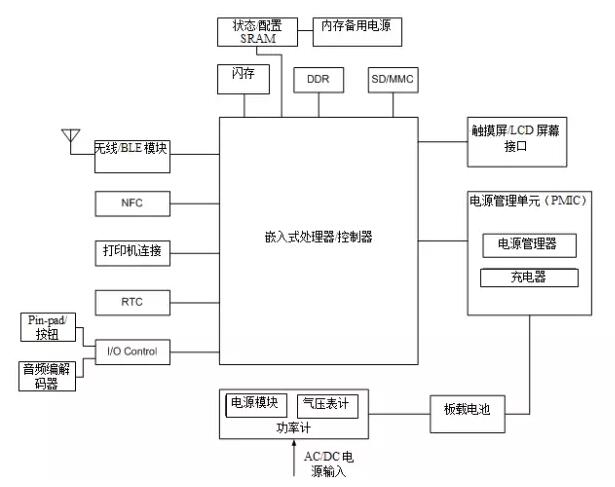 圖1. 這是現(xiàn)代POS終端的框圖。所使用的存儲器包括閃存、SRAM、DRAM和SD/MMC插槽。