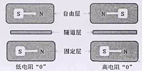 如下圖二所示,MTJ有三層,最上層為自由層,中間是隧道結(jié),下面是固定層。自由層的磁場極化方向是可以改變的,而固定層的磁場方向固定不變。當自由層與固定層的磁場平行時,存儲單元呈現(xiàn)低阻態(tài);當磁場方向相反時,存儲單元呈現(xiàn)高阻態(tài)。MRAM通過檢測存儲單元電阻的高低,來判斷所存數(shù)據(jù)是0還是1。