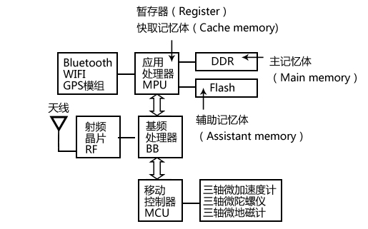 所有的電子產(chǎn)品都必須用到存儲器,而且通常用到不只一種存儲器,由于存儲器的種類繁多,常常讓使用者混淆,我們簡單說明不同存儲器之間的差異,圖三為手機(jī)主要芯片的系統(tǒng)方塊圖(System block diagram),包括:應(yīng)用處理器(Application processor)、基頻處理器(Baseband processor)、運動控制器(Motion Controller)。