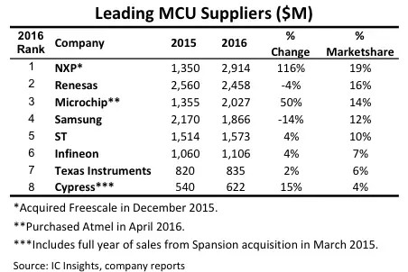 收購(gòu)飛思卡爾前,NXP在2015年的排名僅為全球第6,而飛思卡爾當(dāng)時(shí)已是全球第二大微控制器供應(yīng)商。